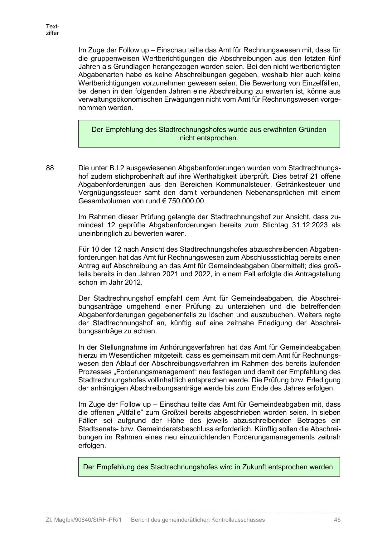 Im Rahmen dieser Prüfung gelangte der Stadtrechnungshof zur Ansicht, dass zumindest 12 geprüfte Abgabenforderungen bereits zum Stichtag 31.12.2023 als