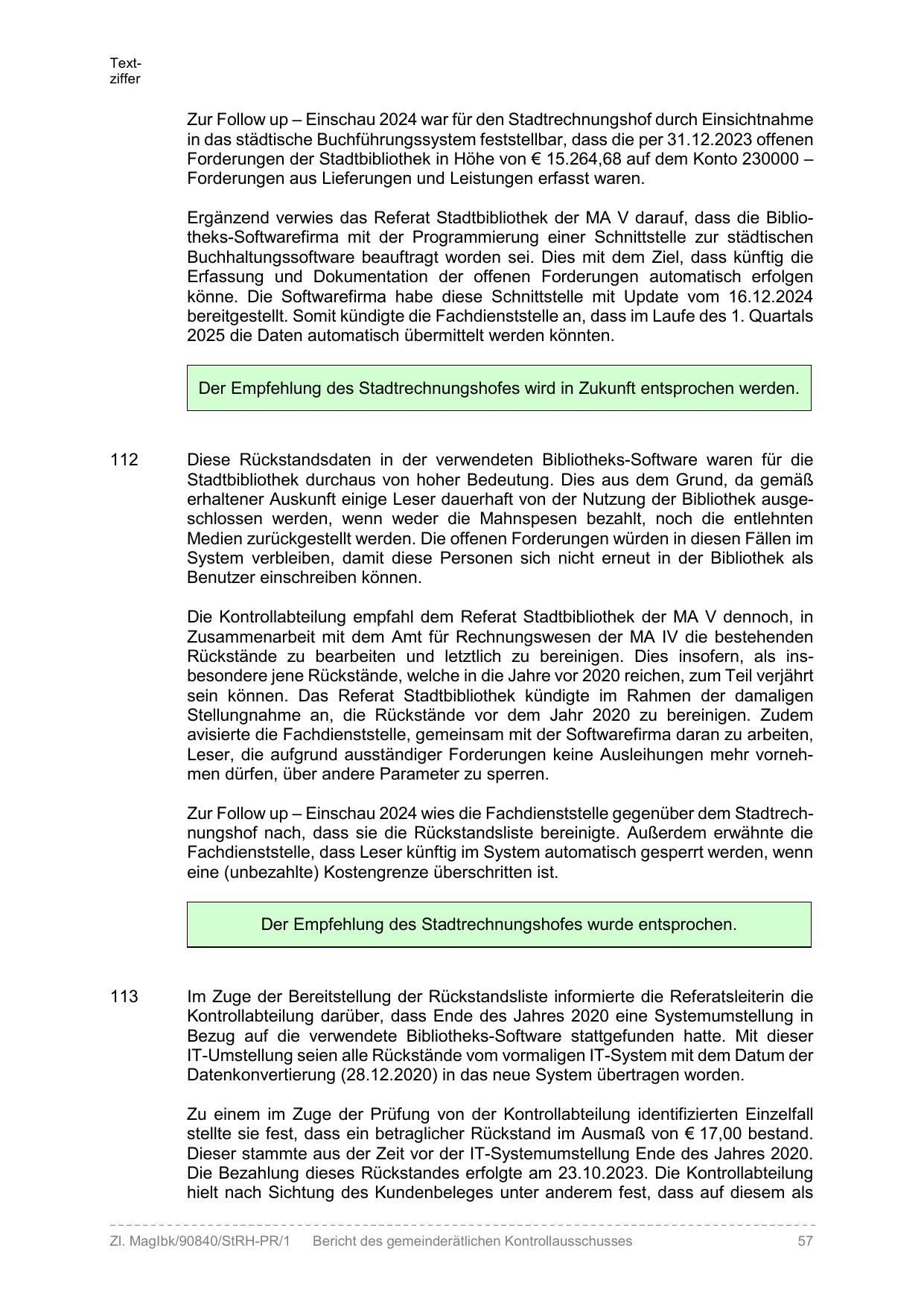 Zur Follow up – Einschau 2024 wies die Fachdienststelle gegenüber dem Stadtrechnungshof nach, dass sie die Rückstandsliste bereinigte. Außerdem erwähnte die
