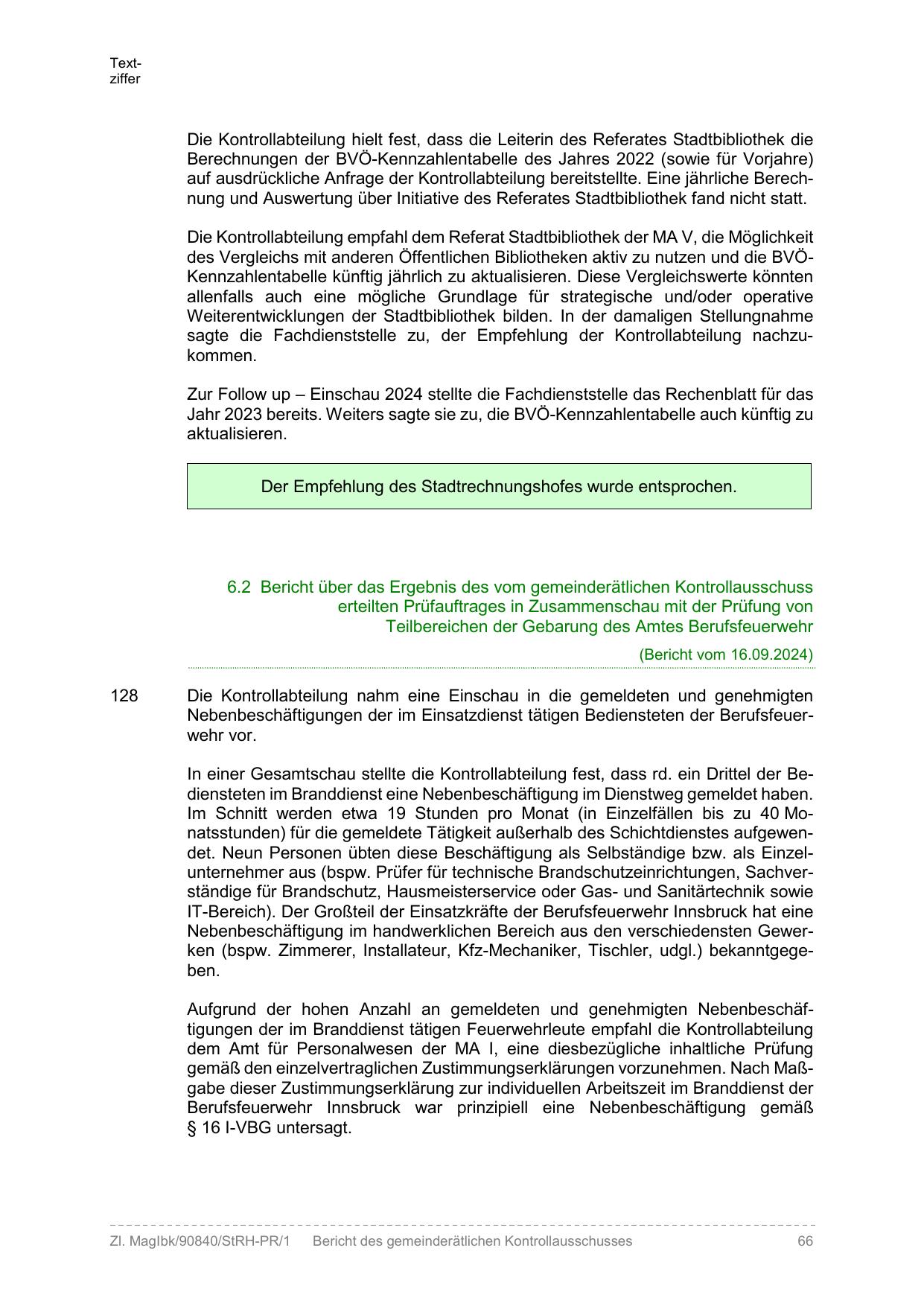 Aufgrund der hohen Anzahl an gemeldeten und genehmigten Nebenbeschäftigungen der im Branddienst tätigen Feuerwehrleute empfahl die Kontrollabteilung