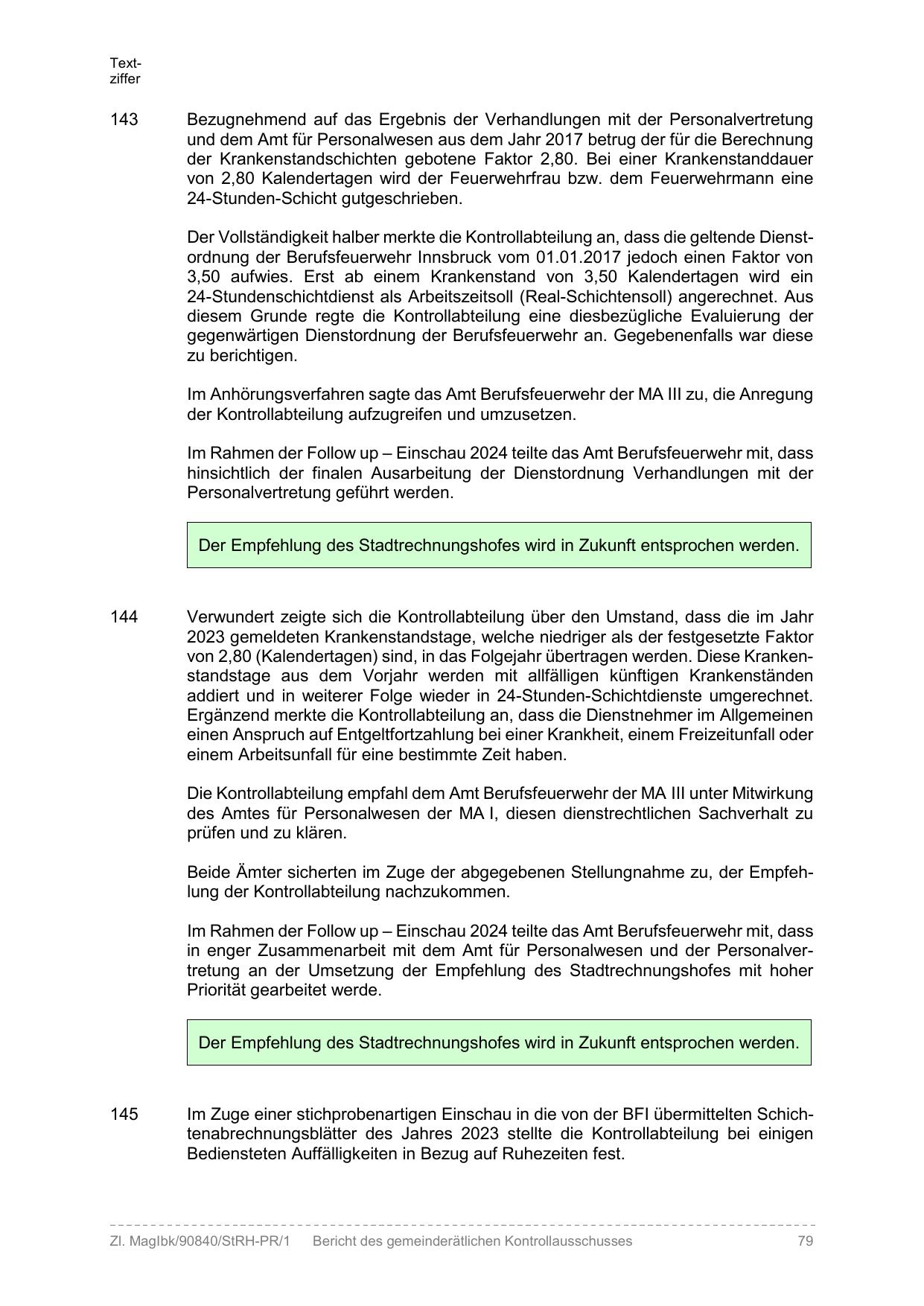 Der Vollständigkeit halber merkte die Kontrollabteilung an, dass die geltende Dienstordnung der Berufsfeuerwehr Innsbruck vom 01.01.2017 jedoch einen Faktor von
