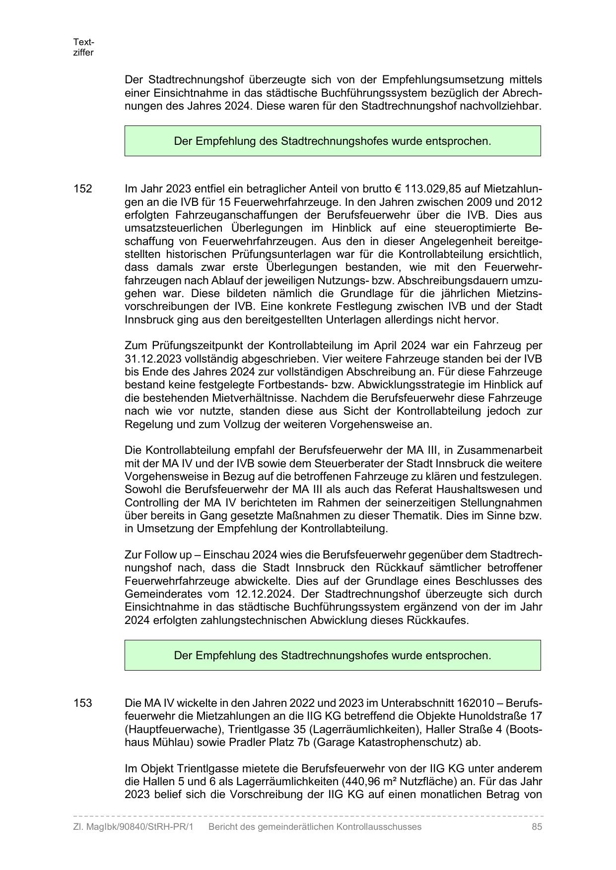 Zur Follow up – Einschau 2024 wies die Berufsfeuerwehr gegenüber dem Stadtrechnungshof nach, dass die Stadt Innsbruck den Rückkauf sämtlicher betroffener
