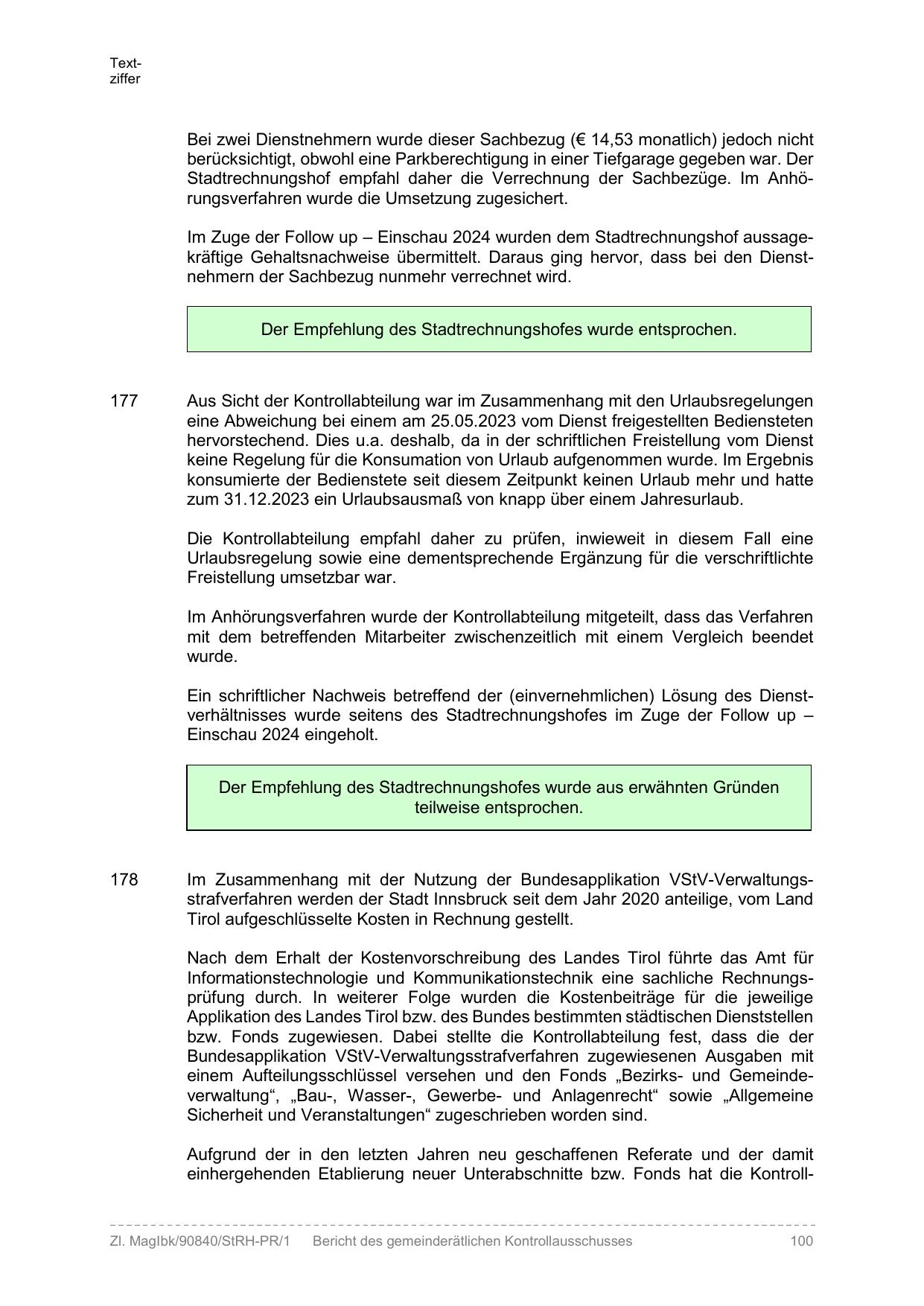 Im Zuge der Follow up – Einschau 2024 wurden dem Stadtrechnungshof aussagekräftige Gehaltsnachweise übermittelt. Daraus ging hervor, dass bei den Dienstnehmern der Sachbezug nunmehr verrechnet wird.