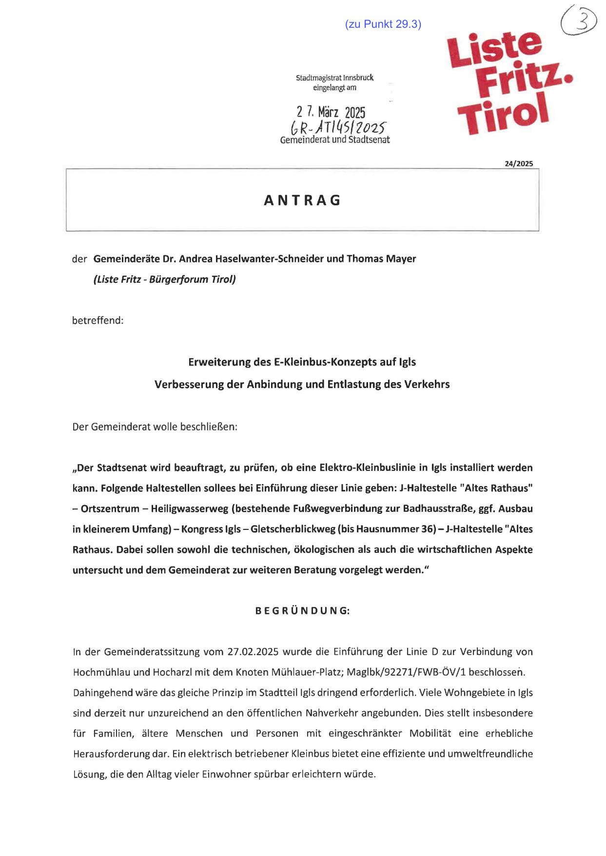 „Der Stadtsenat wird beauftragt, zu prüfen, ob eine Elektro-Kleinbuslinie in Igls installiert werden