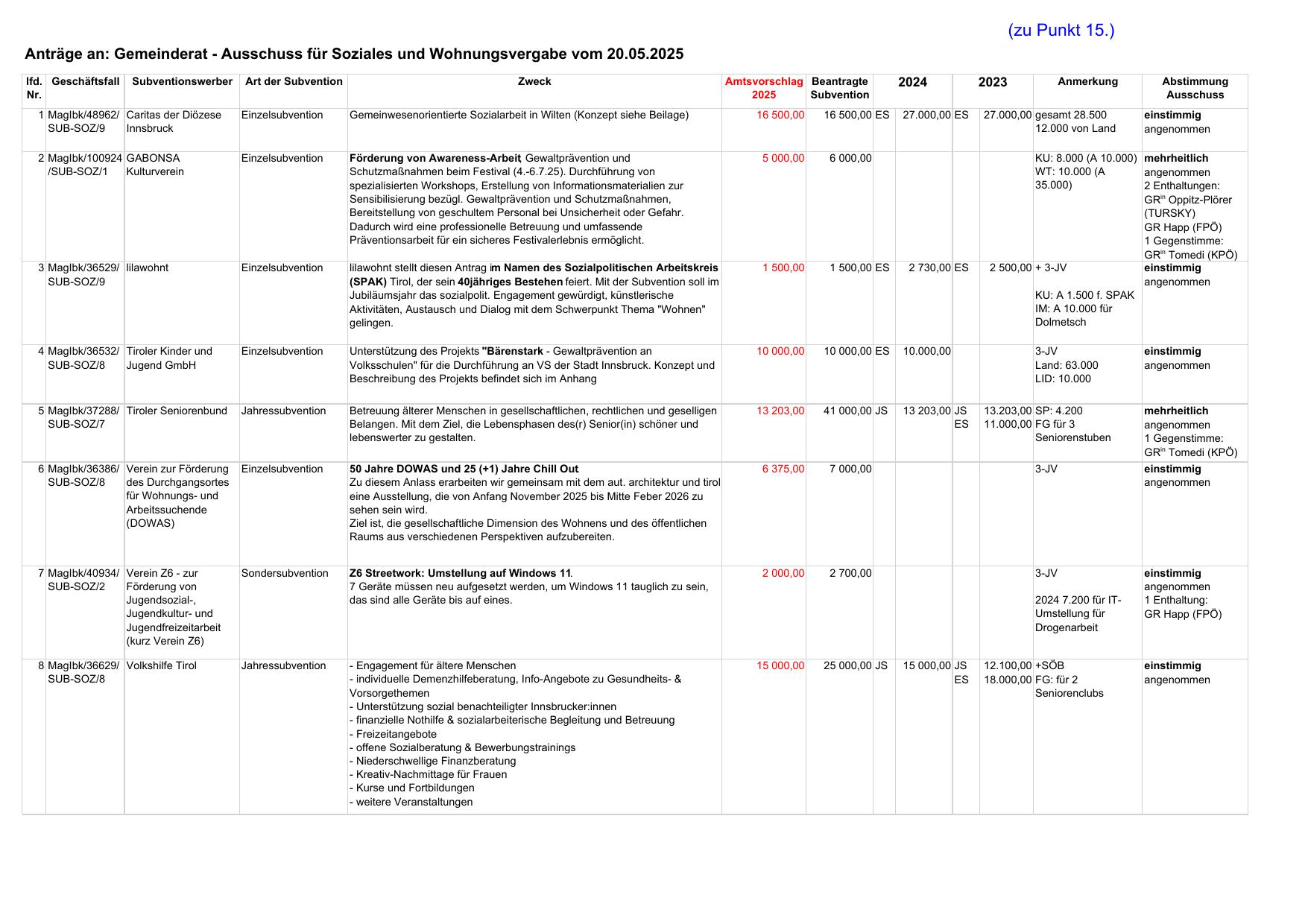 Anträge an: Gemeinderat - Ausschuss für Soziales und Wohnungsvergabe vom 20.05.2025