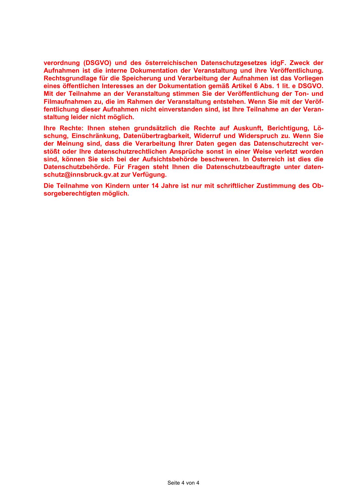 Datenschutzbehörde. Für Fragen steht Ihnen die Datenschutzbeauftragte unter datenschutz@innsbruck.gv.at zur Verfügung.