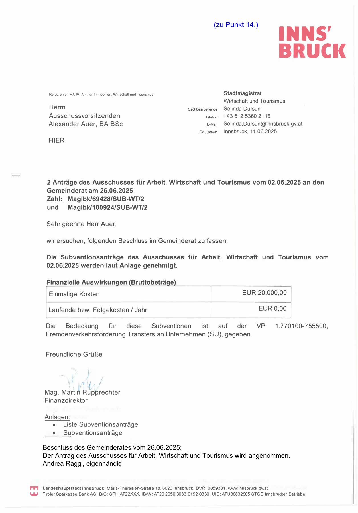 2 Anträge des Ausschusses für Arbeit, Wi scha und Tourismus vom 02.06.2025 an den